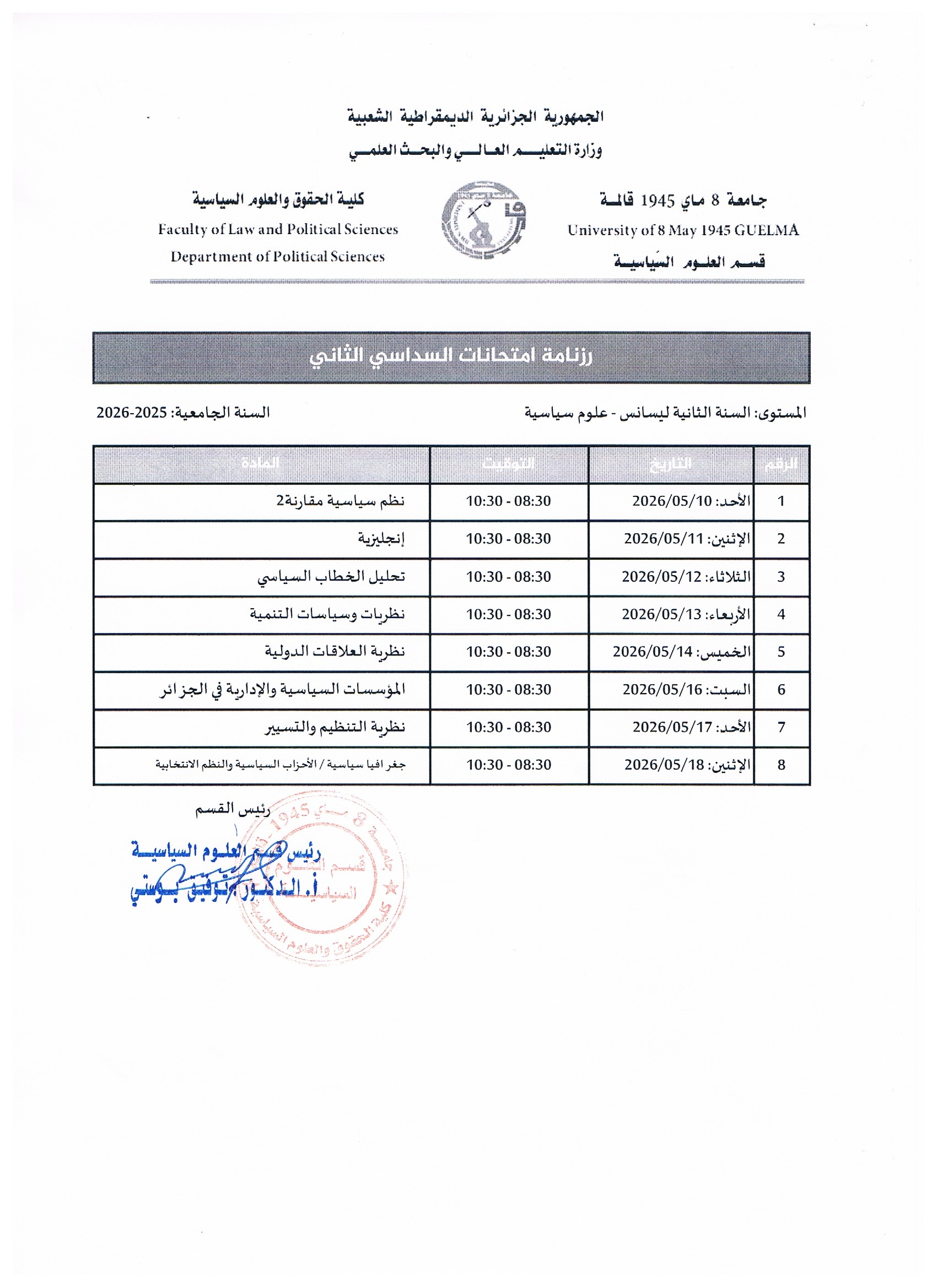 علوم سياسية السنة أولى ليسانس السنة الثانية ليسانس السنة الثالثة تنظيم سياسي واداري السنة أولى ماستر تسيير عمومي السنة أولى ماستر مهني - إدارة الأعمال السياحية Tags actualité